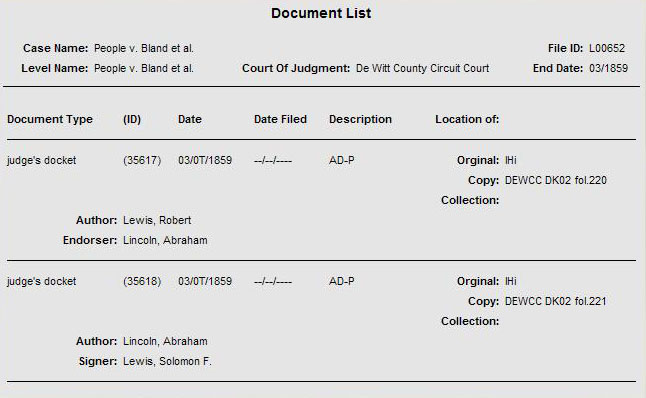 You can view the participants in the case either alphabetically by last (or business) name by clicking the Name link above the list, or you can see a list ordered by their relative prominence in the case by clicking the Role link. There are biographies available for those participants who figured most prominently in Lincoln’s legal career. If there is a biography for a participant−indicated by a Bio link to the left of the name−click on Bio to view it. You can browse through all the biographies that are available by referring to the Reference Section.